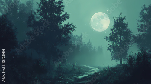tranquil, forest, glowing, moon, tall, tree, misty, path, honed, sense, mystery, calm, illustration