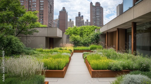 A tranquil garden featuring sleek architectural designs, surrounded by towering urban buildings, offering a peaceful retreat.