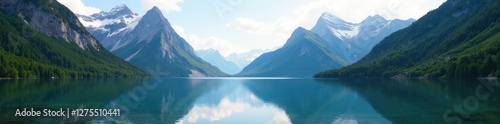 A tranquil lake reflects the majestic peaks of Rocky Mountains, landscape, scenery, water