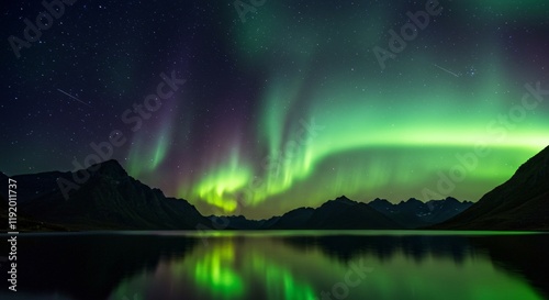 A tranquil mountain lake reflecting a sky filled with auroras and shooting stars