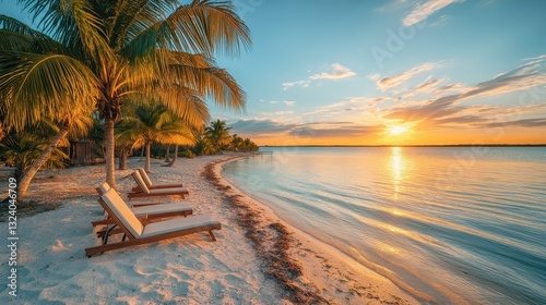 A tranquil oasis, where clear saltwater water reflects a cerulean sky, is framed by lush palm trees and sun-bleached lounge chairs, bathed in the golden glow of a tropical sunset, all isolated on a