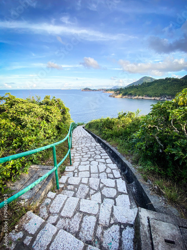 hong kong, pathway, nature, scenic view, ocean, blue skies, cloud, greenery, peaceful, tranquil, railing, travel destination, hiking trail, natural beauty, exploration, adventure, vacation spot