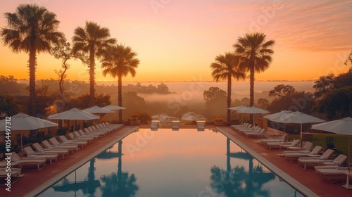 pool, palm, tree, sunrise, mist, fog, sky, horizon, water, morning, sunlight, dawn, landscape, resort, travel, vacation, luxury, relax, peace, calmness, serene, calm, beautiful, tropical, summer, leisure, idylli, swimming, get-away, spa, holiday, destination, paradise, dream, escape, oasis, beach, island, ocean, coast