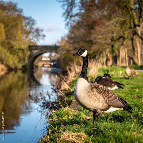 river, goose, bridge, water, green, landscape, nature, outdoors, tree, sunlight, calm, peaceful, stone, animal, bird, grass, wildlife, day, scenic