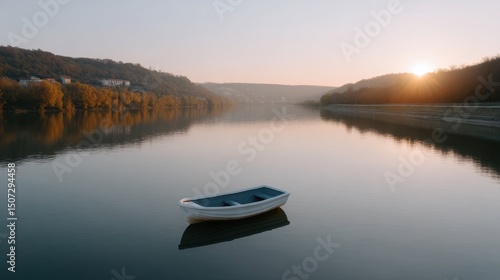 A tranquil scene of a small boat gently floating on a calm river at sunrise, surrounded by autumn foliage. The mirror-like water reflects the warm hues of the early morning light.