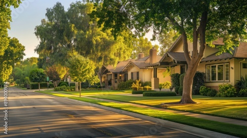 A tranquil suburban street at dawn with a sandy beige Craftsman style house, lush green trees, and perfectly trimmed lawns under soft morning light