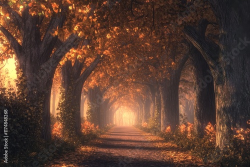 pathway, autumn, tree, leaf, tranquil, sunlight, vibrant, nature, serene, atmosphere, beauty, forest, scenery, landscape, foliage, peaceful, warmth, outdoors, afternoon, gold, branch, light, environment, enchanting, walk, route, scenic, rustic, cosy, glowing, colours, change, harvest, season, relaxation