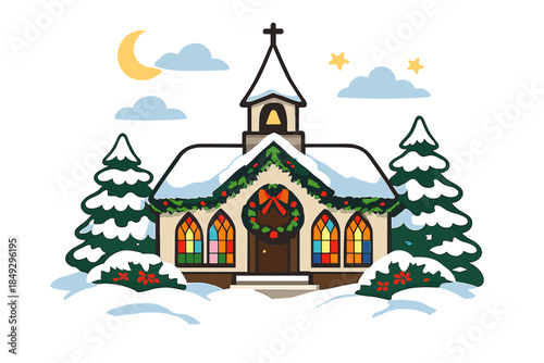 A tranquil winter landscape shows a church blanketed in snow, its bright stained‑glass windows illuminated, decorated with holly and garlands, evoking peace and joy