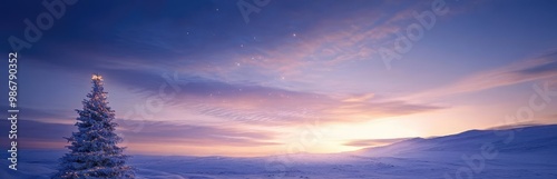A tranquil winter scene with a sleigh, reindeer, and a snowy tree at sunset, evoking the magic of the holiday season.