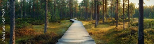 A tranquil wooden pathway meandering through a lush forest with sunlight streaming through the trees.