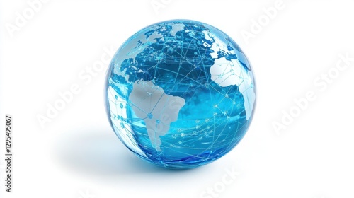 A transparent 3D globe with neon blue networking lines crisscrossing continents, symbolizing a hyper-connected world