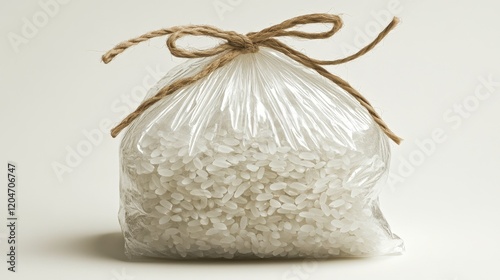 rice, bag, plastic, transparent, white, grain, food, kitchen, cooking, ingredient, twine, rope, tied, knot, bow, bundle, package, container, staple, pantry, store, supermarket, grocery, healthy, diet, carbohydrate, cereal, grain, eat, meal, prepare, cook, eat, nourishment, energy, harvest, agriculture, farm, natural, organic, simple, pure