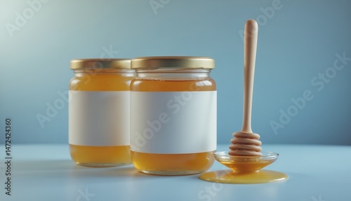 A transparent glass jar of honey with a blank label, great for branding, customization, adding text or graphics