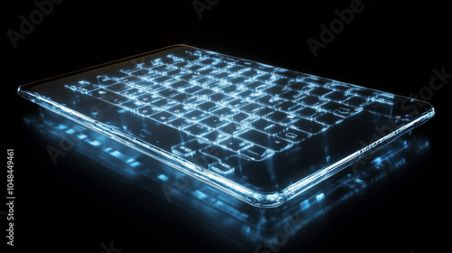 A transparent tablet with a digital virtual keyboard projection, showing advanced input technology where a virtual keyboard image is projected onto a surface.