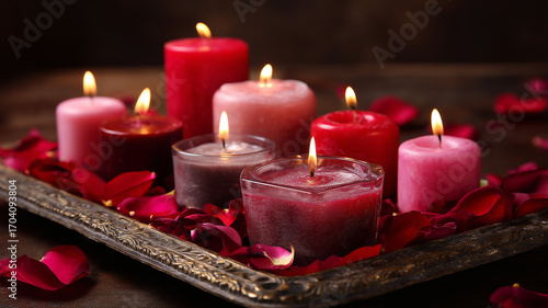 A tray of scented candles for valentine's day, pink and red candles with rose petals around them, creating an atmosphere for the special evening. Ai generated
