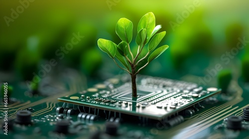 A tree growing on a computer circuit board in symbol of Green Technology Environmental awareness