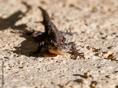 A tree lizard hangs out on a wall in the Arizona sun seemingly happy.