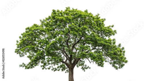 A tree with vibrant green leaves stands against a white background