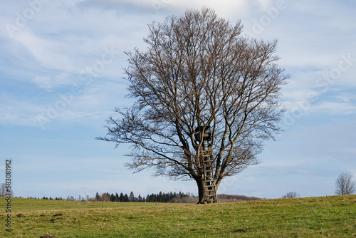 a tree without leaves with a hide for hunters on a green meadow under a blue sky