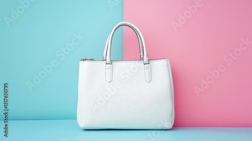 A trendy white handbag with a metallic zipper placed on a soft pastel background