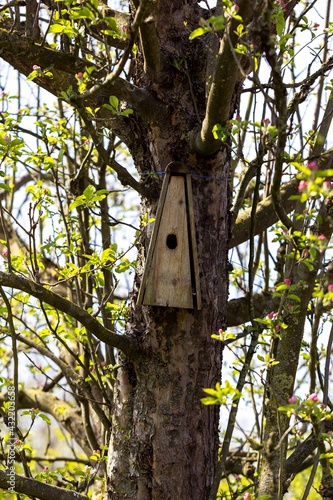 A triangular wooden homemade birdhouse nailed to a apple tree in springtime. The hole of the mounted next box is visible, ready to shelter some birds and their young.