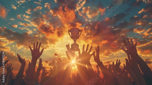 trophy, team, orange, achievement, teamwork, celebration, sunset, success, group, people, hand, goal, crowd, oneness, award, gold, inspiration, joy, cloud, sky, winning, victory, competition, sport, silhouette, motivation, challenge, evening, togetherness, aspiration, glory, accomplishment, reward, outdoors, excitement, sharing, determination, leadership, recognition, uplifting, applause, congratulation, ambition