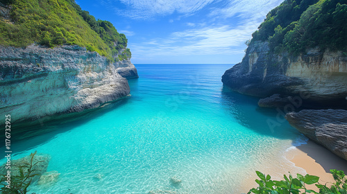 A tropical beach scene shows bright turquoise water nestled between rocky cliffs