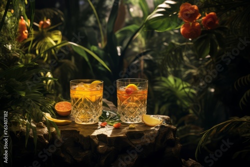 A tropical rainforest setting with glasses of rum punch amid lush foliage, inviting viewers to immerse themselves in nature's tranquility