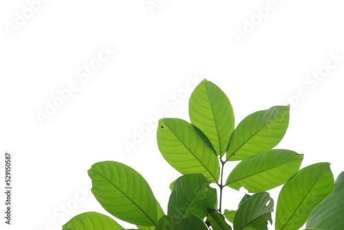 A tropical tree with leaves branches on white isolated background for green foliage backdrop