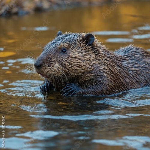 A turquoise-furred beaver cub swimming gracefully through a golden autumn river.