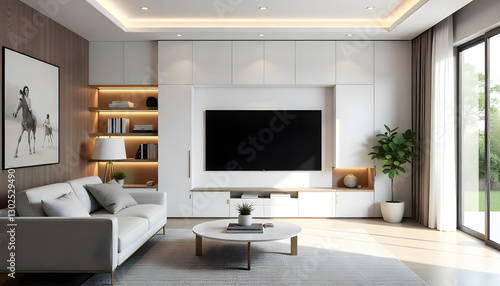 A Tv cabinet design with white wall paneling and stanless shelf.