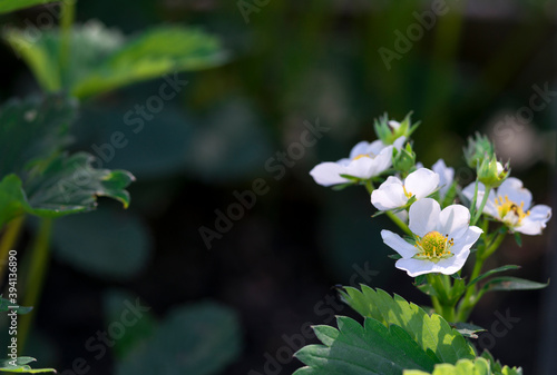 a twig of blooming strawberries in the garden on the bed - spring background on dark backdrop