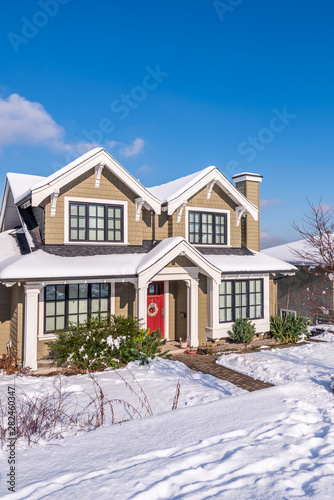 A typical american house in winter. Snow covered.