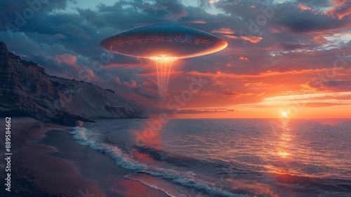 A UFO hovering above a remote beach at sunrise, its lights reflecting on the ocean waves and creating a serene and peaceful scene.
