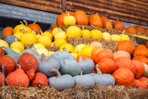 A variety of Blue Prince, Red Kuri, Hokkaido, and Sunlight pumpkins on straw.