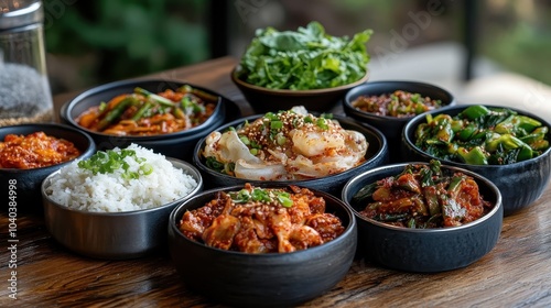 A variety of colorful Korean side dishes, including kimchi and rice, are artfully arranged on a wooden table, showcasing culinary diversity and rich flavors.