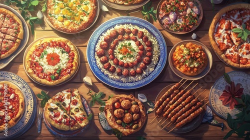 sunlight, view, dish, meal, meatball, abundance, pizza, plate, cookery, plate, top, meat, table, delicious, summer, fresh, variety, display, healthy, vegetable, wooden, food, rustic, grilled, cheese, ingredient, platter, sauce, colourful, arrangement, homemade, tasty, rice