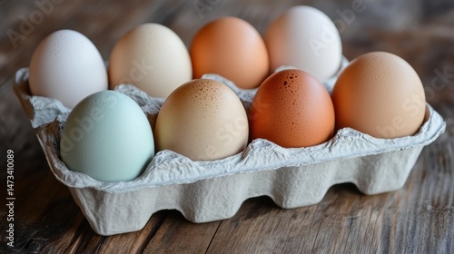 A Variety of Eggs in a Cardboard Carton on a Wooden Surface