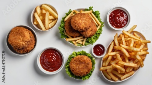 A variety of food items such as burgers, fries, and ketchup on a white background.