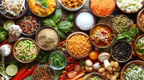 A variety of foods displaying diverse flavors and cuisines.