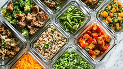 A variety of fresh, colorful vegetables and cooked dishes are neatly arranged in glass containers on a marble surface.