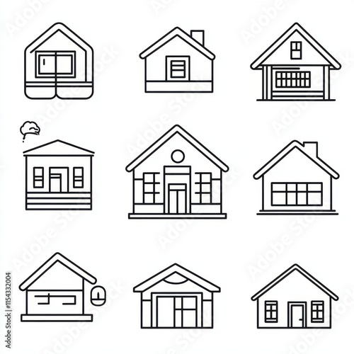 A variety of house icons showcasing diverse architectural styles in a minimalist line art design.