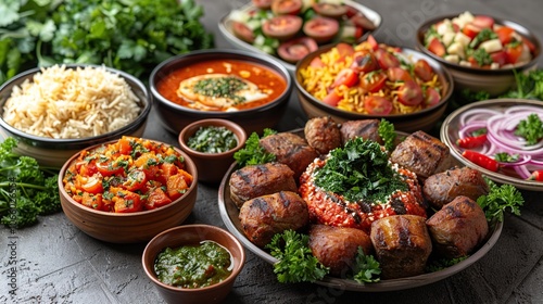 A variety of Indian dishes, including grilled kebabs, rice, and a tomato-based curry, are arranged on a table.