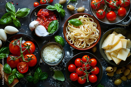 food, ingredient, italian, tomatoes, basil, cooking, healthy, menu, nourishment, fresh, meal, epicure, vegetable, cookery, background, top, vegan, assortment, garlic, meat, pasta, board, wooden, delicious, traditional, pepper, lunch, herb, cheese, macaroni, sauce, vegetarian, table, green, view, pizza, variety, diet, kitchen, olive, receipe, eatery, dinner, spaghetti, leaf, homemade, mediterranean, raw