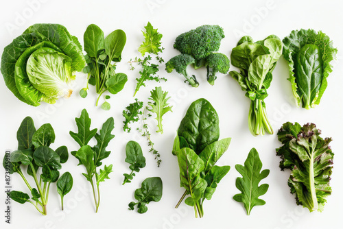 A variety of leafy greens arranged on a white background