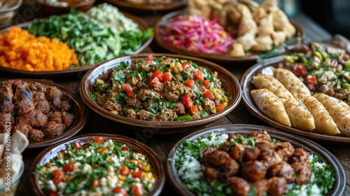A variety of Middle Eastern dishes laid out on a wooden table. The photo shows a variety of dishes, including salads, meat, and rice, and can be used for food blogs, restaurants, and recipes.