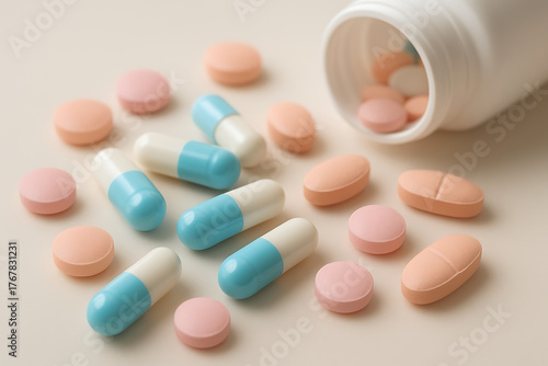 A variety of pharmaceutical capsules and tablets in blue, white, and peach colors spilled out from a white plastic medicine bottle on a light beige surface, illustrating health and medical care