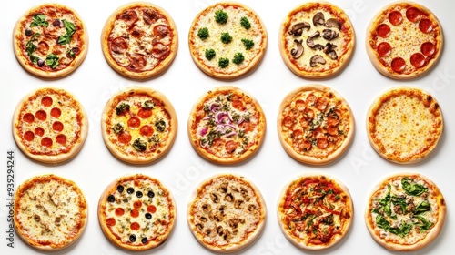 A variety of pizzas displayed in a grid format, showcasing different toppings and styles.