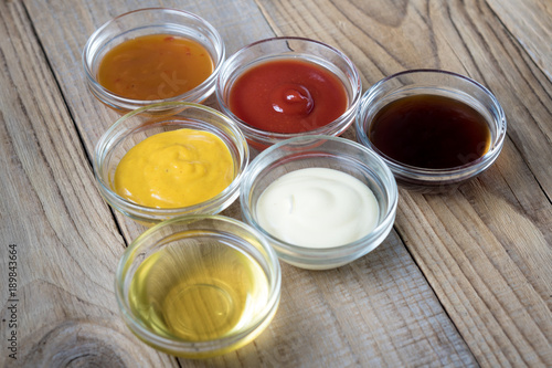 a variety of sauces in glass bowls on a wooden table