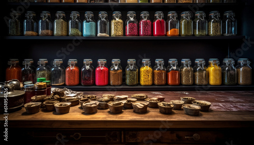 variation, food, wood, indoor, spice, jar, collection, bottle, medicine, equipment, closeup, healthy eating, large, cooking, freshness, glasses, variety, in a row, science, table, arrangement, herb, kitchen, drink, vegetable, pepper, seasoning, dark, container, garlic, nature, pharmacy, industry, abundance, shelf, craft, workshop, metal, herbal medicine, condiment, chili pepper